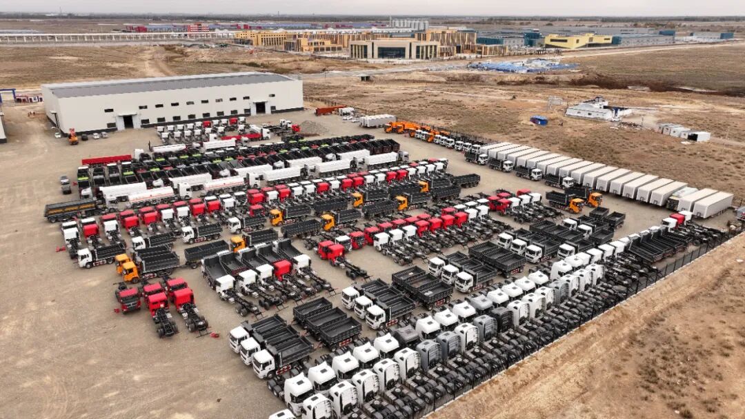 新疆乾錦禾汽車(chē)服務(wù)有限公司大件設(shè)備轉(zhuǎn)運(yùn)中心停放的車(chē)輛。塔城地區(qū)融媒體中心記者汪春林?jǐn)z