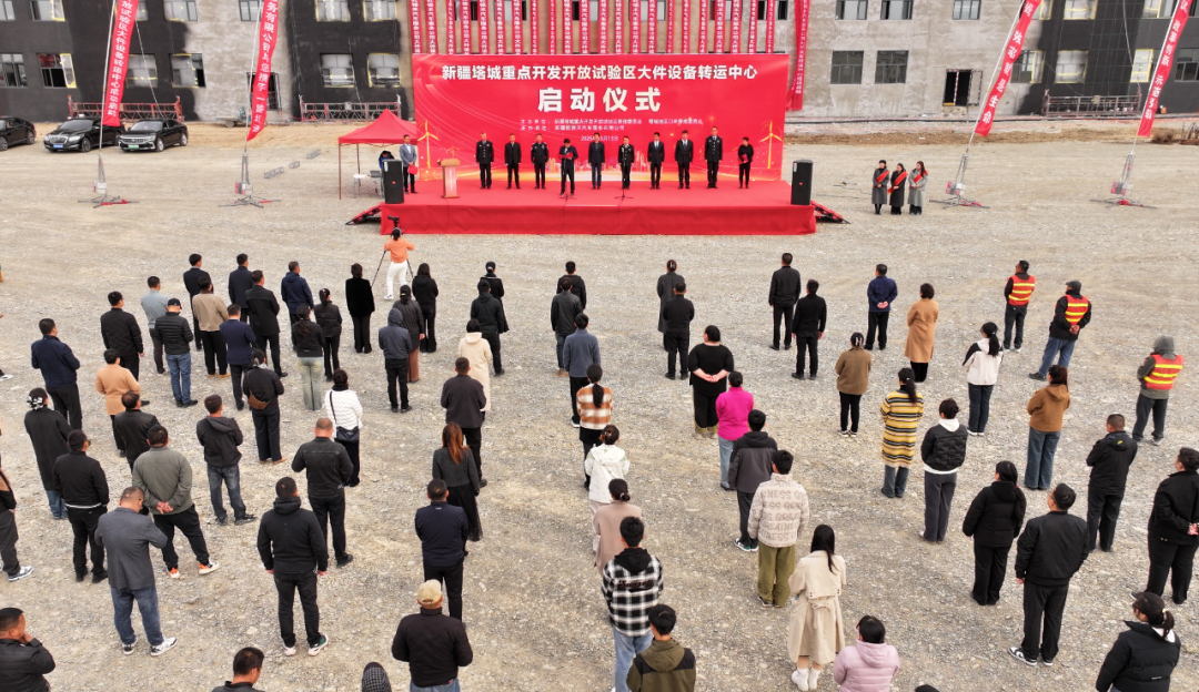 新疆塔城重點(diǎn)開(kāi)發(fā)開(kāi)放試驗(yàn)區(qū)大件設(shè)備轉(zhuǎn)運(yùn)中心啟動(dòng)儀式現(xiàn)場(chǎng)。塔城地區(qū)融媒體中心記者汪春林?jǐn)z