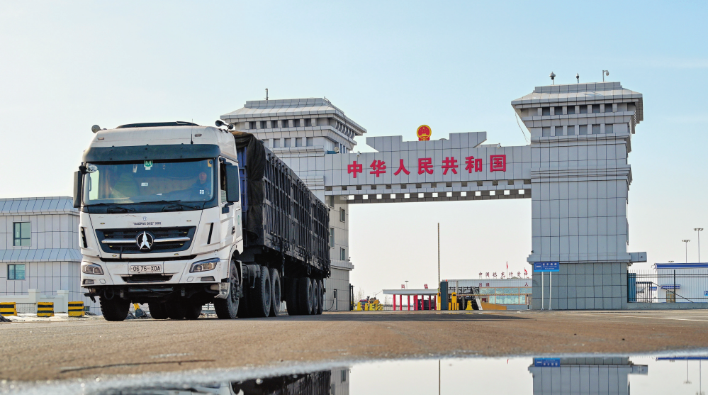 在新疆塔克什肯口岸,運(yùn)輸車輛在 通過國門(2024 年 3 月 13 日攝) 陳朔攝 / 本刊
