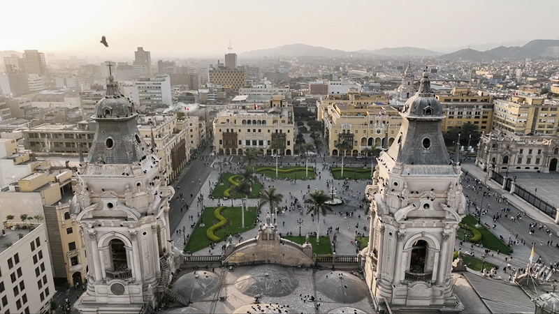 這是10月13日拍攝的秘魯首都利馬武器廣場(chǎng)(無(wú)人機(jī)照片)。新華社記者 李木子 攝