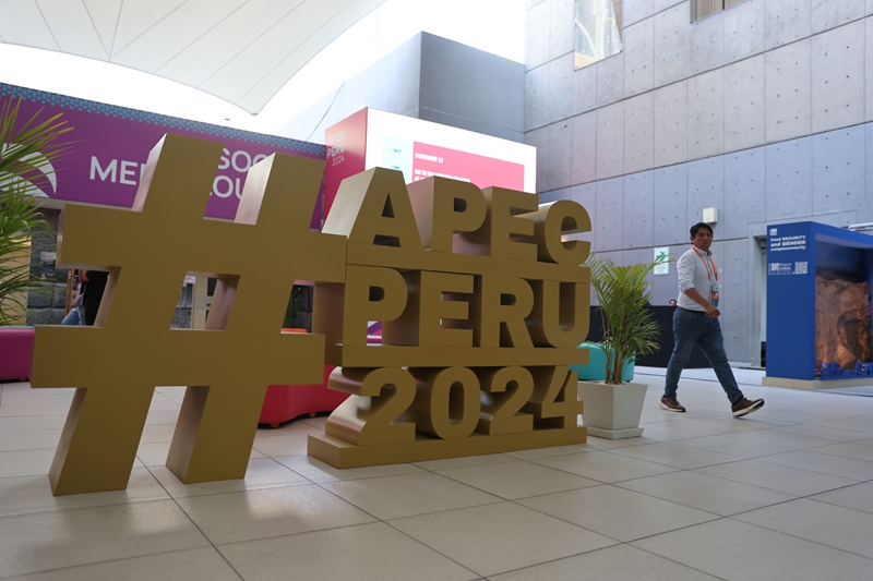 11月13日,人們從秘魯首都利馬會(huì)議中心外的2024年亞太經(jīng)濟(jì)合作組織(APEC)會(huì)議標(biāo)識(shí)前走過(guò)。新華社發(fā)(瑪麗安娜·巴索 攝)