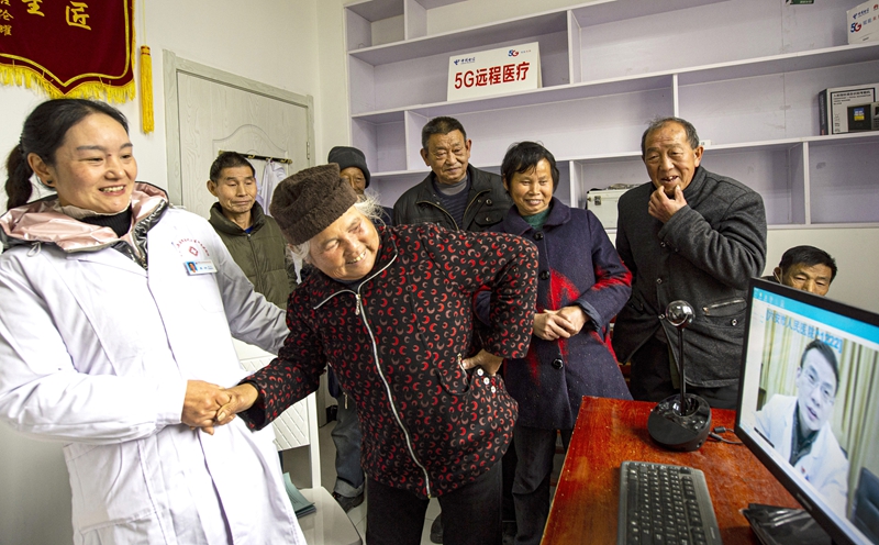 2020年12月3日,安徽省金寨縣大灣村的一名村民(前左二)指著自己身體疼痛的部位,在村醫(yī)(左一)的幫助下向5G遠(yuǎn)程醫(yī)療會診的專家講述病情。新華社發(fā)(陳力 攝)
