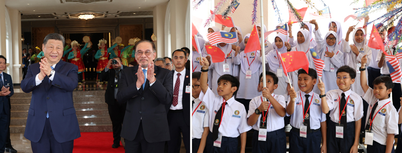 習(xí)近平乘車抵達總理官邸時,安瓦爾熱情迎接。馬來西亞青少年揮舞兩國國旗,奏響歡快的鼓樂,跳起熱情的民族舞蹈,熱烈歡迎遠道而來的貴賓。