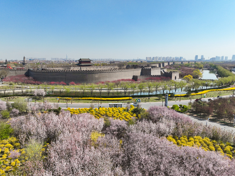 河北省正定古城南城門春色(2025年3月31日攝,無(wú)人機(jī)照片)。新華社發(fā)(梁子棟 攝)