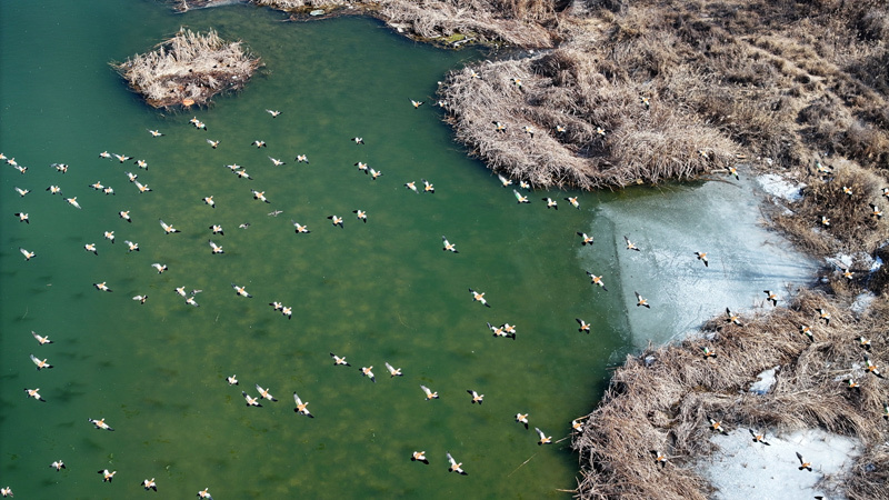 候鳥在黃河寧夏段一處濕地棲息、覓食(2025年2月26日攝,無(wú)人機(jī)照片)。新華社記者 王鵬 攝