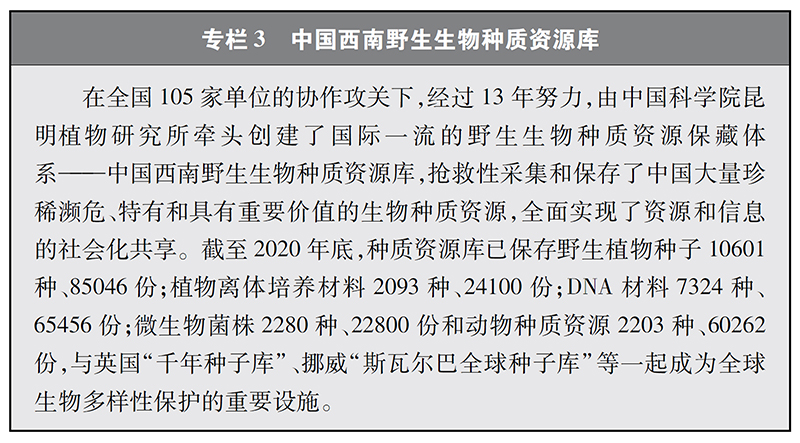 加快重要生物遺傳資源收集保存和利用。中國高度重視生物資源保護,近年來在生物資源調(diào)查、收集、保存等方面取得較大進展。實施戰(zhàn)略生物資源計劃專項,完善生物資源收集收藏平臺,建立種質資源創(chuàng)新平臺、遺傳資源衍生庫和天然化合物轉化平臺,持續(xù)加強野生生物資源保護和利用。實施一批種質資源保護和育種創(chuàng)新項目,截至2020年底,形成了以國家作物種質長期庫及其復份庫為核心、10座中期庫與43個種質圃為支撐的國家作物種質資源保護體系,建立了199個國家級畜禽遺傳資源保種場(區(qū)、庫),為90%以上的國家級畜禽遺傳資源保護名錄品種建立了國家級保種單位,長期保存作物種質資源52萬余份、畜禽遺傳資源96萬份。建設99個國家級林木種質資源保存庫,以及新疆、山東2個國家級林草種質資源設施保存庫國家分庫,保存林木種質資源4.7萬份。建設31個藥用植物種質資源保存圃和2個種質資源庫,保存種子種苗1.2萬多份。
