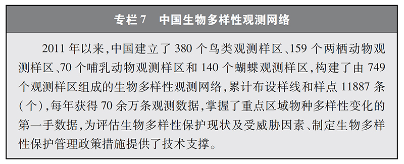 完善監(jiān)測觀測網(wǎng)絡。中國建立起各類生態(tài)系統(tǒng)、物種的監(jiān)測觀測網(wǎng)絡,在生物多樣性理論研究、技術示范與推廣以及物種與生境保護方面發(fā)揮了重要作用,為科研、教育、科普、生產(chǎn)等各領域提供了多樣化的信息服務與決策支持。其中,中國生態(tài)系統(tǒng)研究網(wǎng)絡(CERN)、國家陸地生態(tài)系統(tǒng)定位觀測研究網(wǎng)絡(CTERN)涵蓋所有生態(tài)系統(tǒng)和要素,中國生物多樣性監(jiān)測與研究網(wǎng)絡(Sino BON)覆蓋動物、植物、微生物等多種生物類群,中國生物多樣性觀測網(wǎng)絡(China BON)構建了覆蓋全國的指示物種類群觀測樣區(qū)。
