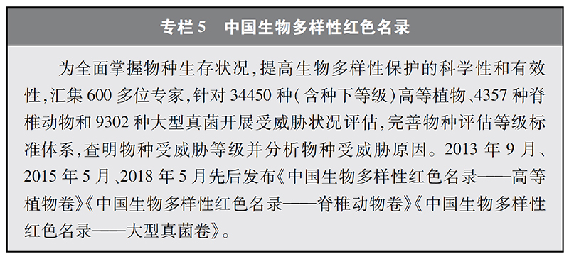 開展全國生物多樣性調(diào)查與評估。大力推進生物多樣性保護重大工程實施,結合自然資源調(diào)查、生態(tài)系統(tǒng)監(jiān)測評估等工作,不斷完善生物多樣性調(diào)查與評估能力,首次將生物多樣性指標納入生態(tài)質量綜合評價指標體系,引導地方加強生態(tài)文明建設與生物多樣性保護。開展自然資源調(diào)查,包括森林、草原、水、濕地、荒漠、海洋等,建立自然資源調(diào)查評價監(jiān)測制度。構建了涵蓋2376個縣級行政單元、樣線總長超過3.4萬公里的物種分布數(shù)據(jù)庫,建立物種資源調(diào)查及收集信息平臺,準確反映野生動植物空間分布狀況。完成長江經(jīng)濟帶、京津冀等國家戰(zhàn)略區(qū)域180多個縣級行政區(qū)生物多樣性調(diào)查與評估。組織開展近海漁業(yè)資源調(diào)查,初步掌握近海漁業(yè)資源狀況。陸續(xù)發(fā)布《中國植物紅皮書》《中國瀕危動物紅皮書》《中國物種紅色名錄》《中國生物多樣性紅色名錄》,基本掌握生物多樣性總體情況,為加強生物多樣性保護奠定了科學基礎。