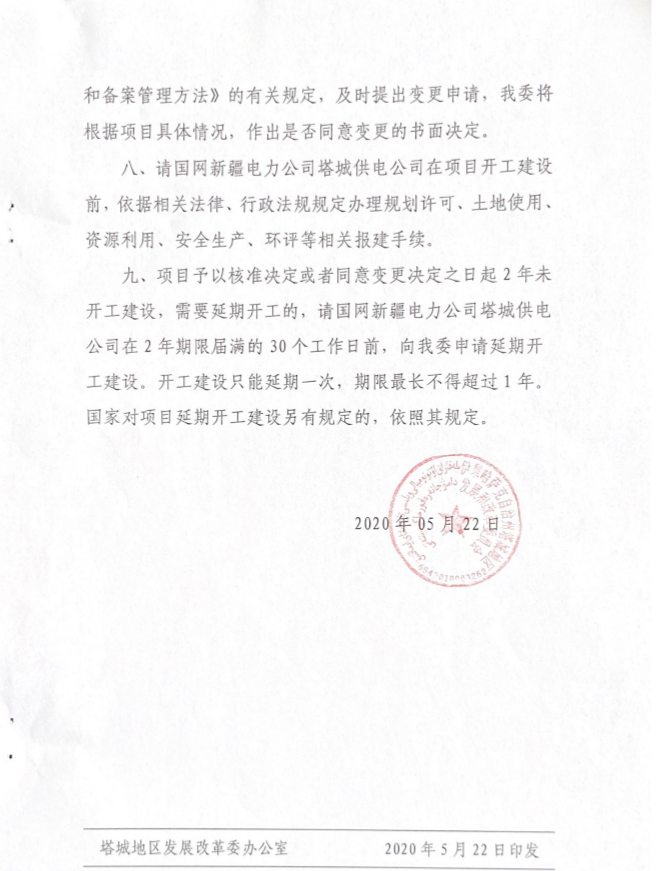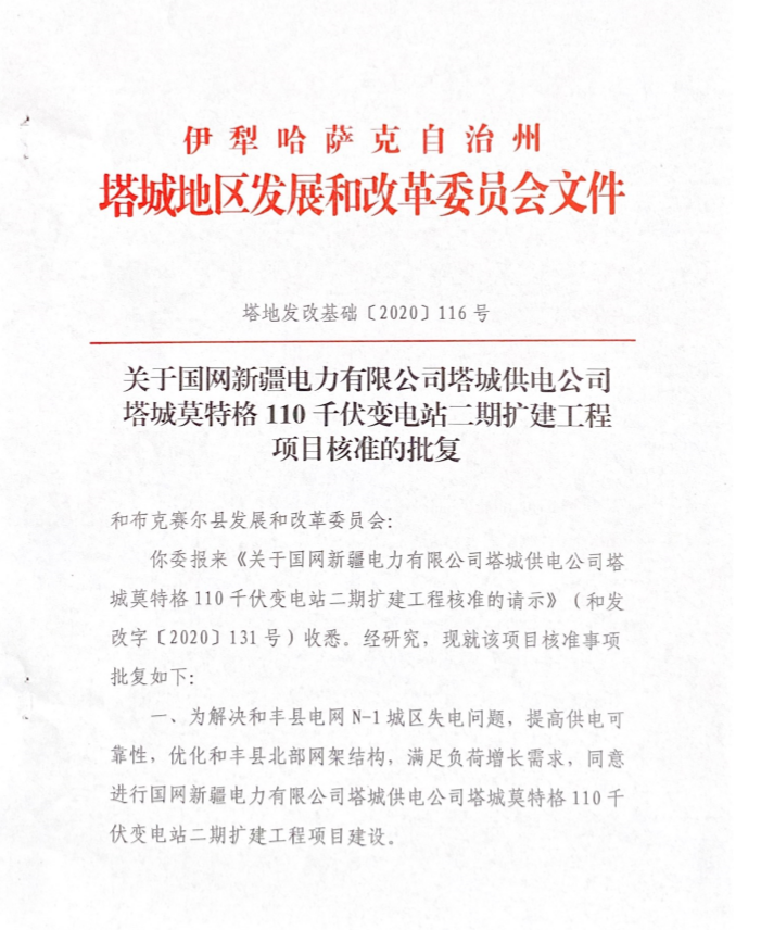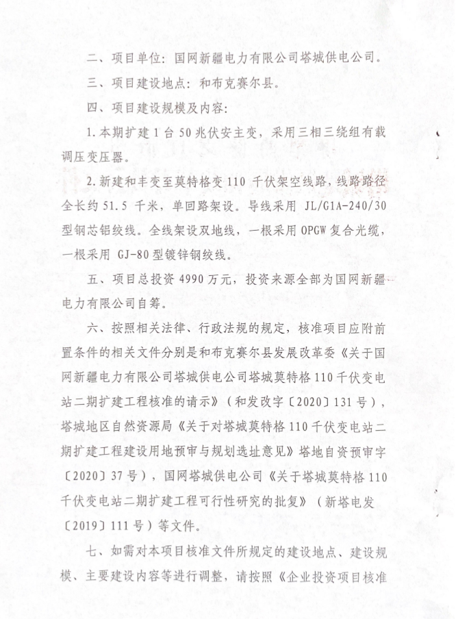 關(guān)于國網(wǎng)新疆電力有限公司塔城供電公司塔城莫特格110千伏變電站二期擴建工程項目核準的批復