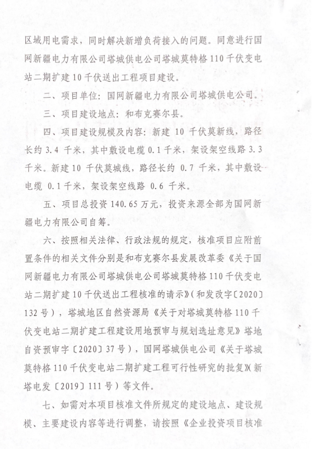 關于國網(wǎng)新疆電力有限公司塔城供電公司塔城莫特格110千伏變電站二期10千伏送出工程項目核準的批復